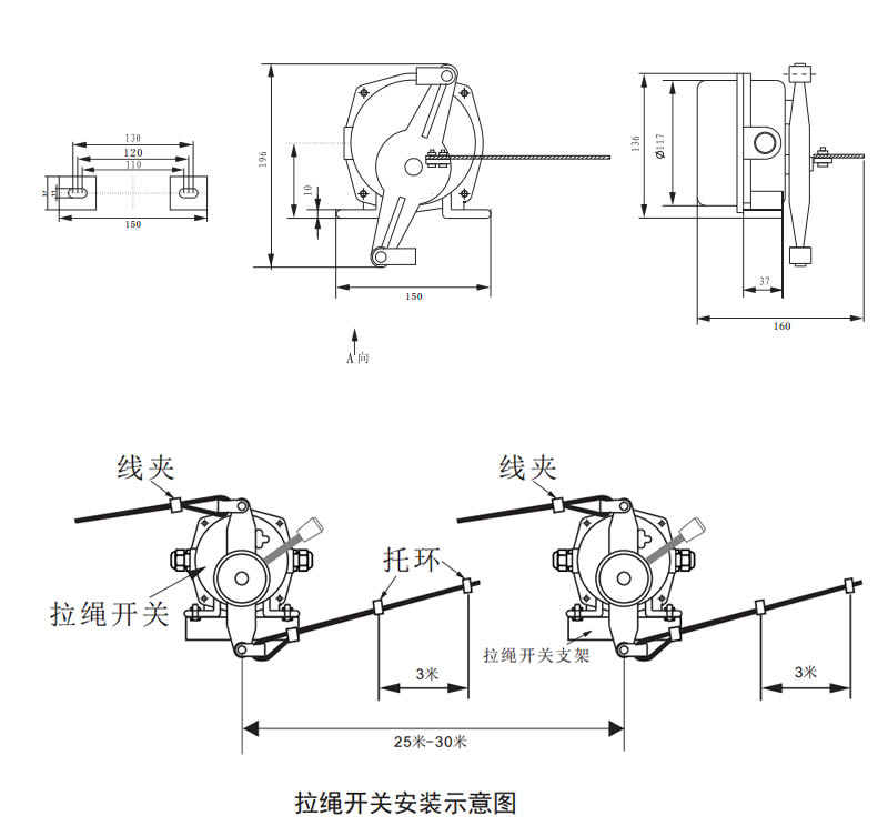 当胶带运输现场发生紧急事故时,可拉动系在拉绳开关吊耳上的钢丝绳,使机内的滑块控制内部微动开关动作,发出停机或警报信号。当拉绳开关动作时,红色指示牌由平行地面状态,变为与地面成90°状态,以便在场工作人员,准切的辨别拉绳开关的动作,和位置所在,松开钢丝绳后需要人工复位,按下红色指示牌与地面成平行状态,拉绳开关为正常模式。